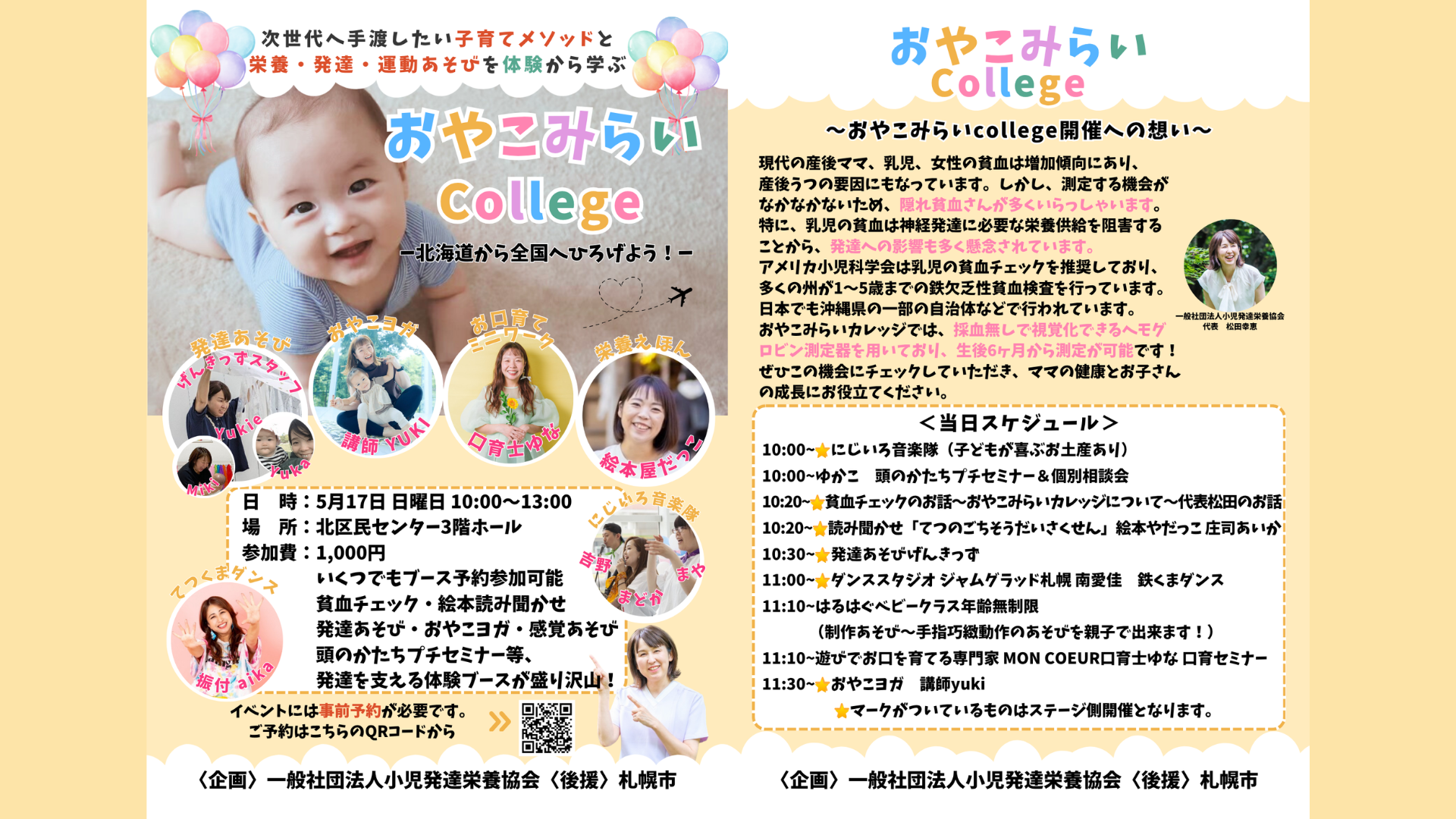 北海道から全国へ! 現代のママや乳幼児に増えている「隠れ貧血」に着目し、栄養・発達・運動あそびを体験から学ぶイベント「第6回おやこみらいCollege」を開催いたします 。