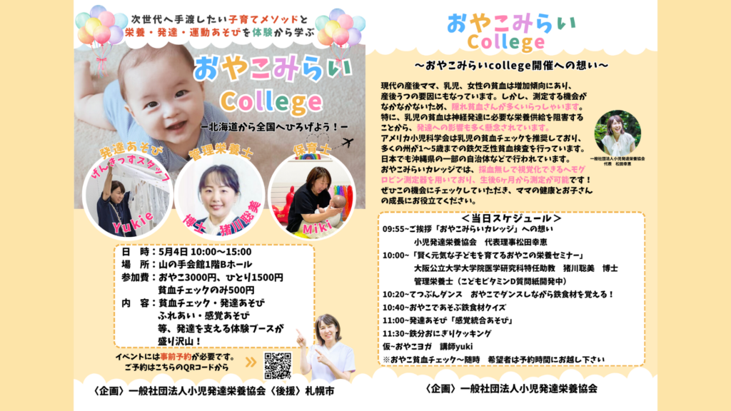 北海道から全国へ! 現代のママや乳幼児に増えている「隠れ貧血」に着目し、栄養・発達・運動あそびを体験から学ぶイベント「第5回おやこみらいCollege」を開催いたし...